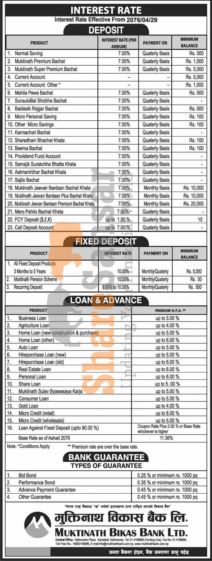 Muktinath Bikas Bank Limited has published a notice regarding new interest rate and its effective from 29th Shrawan, 2076.