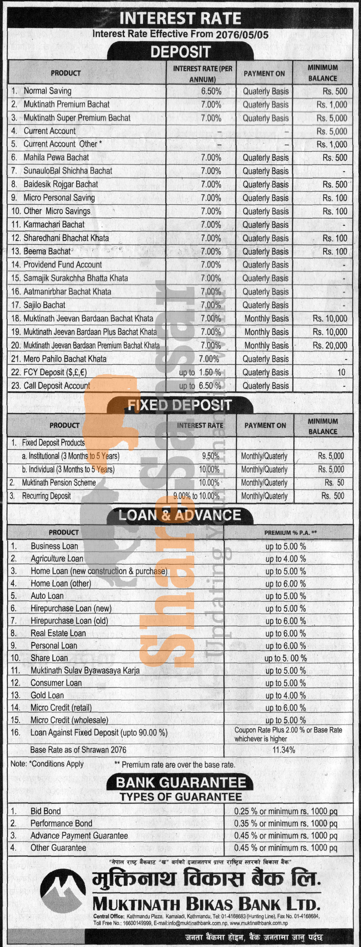 Muktinath Bikas Bank Limited has published a notice regarding new interest rate and its effective from 5th Bhadra, 2076.