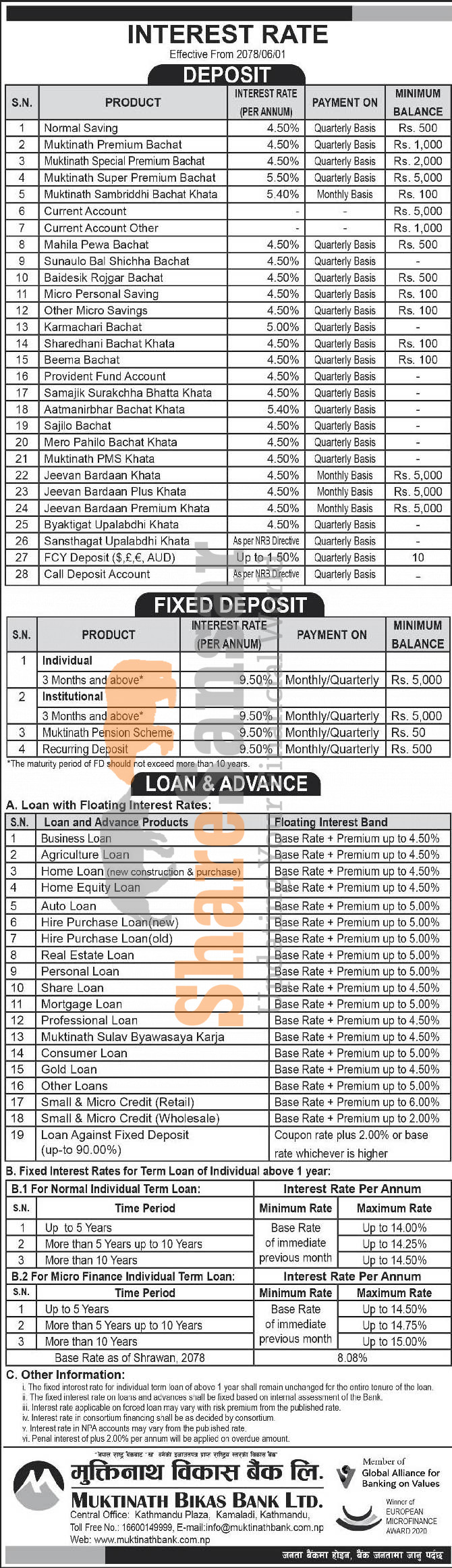 Muktinath Bikas Bank Limited has published a notice regarding the new interest rate for deposit and loan products and it's effective from 1st Ashwin, 2078.