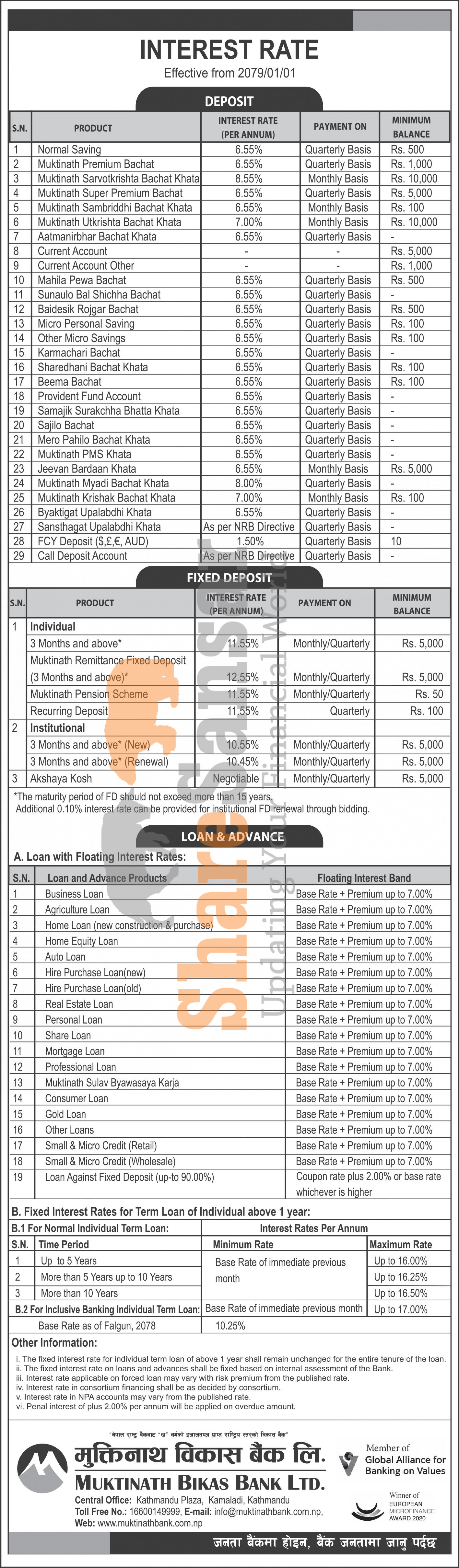 Muktinath Bikas Bank Limited has published a notice regarding the new interest rate for deposit and loan products and it's effective from 1st Baisakh, 2079.