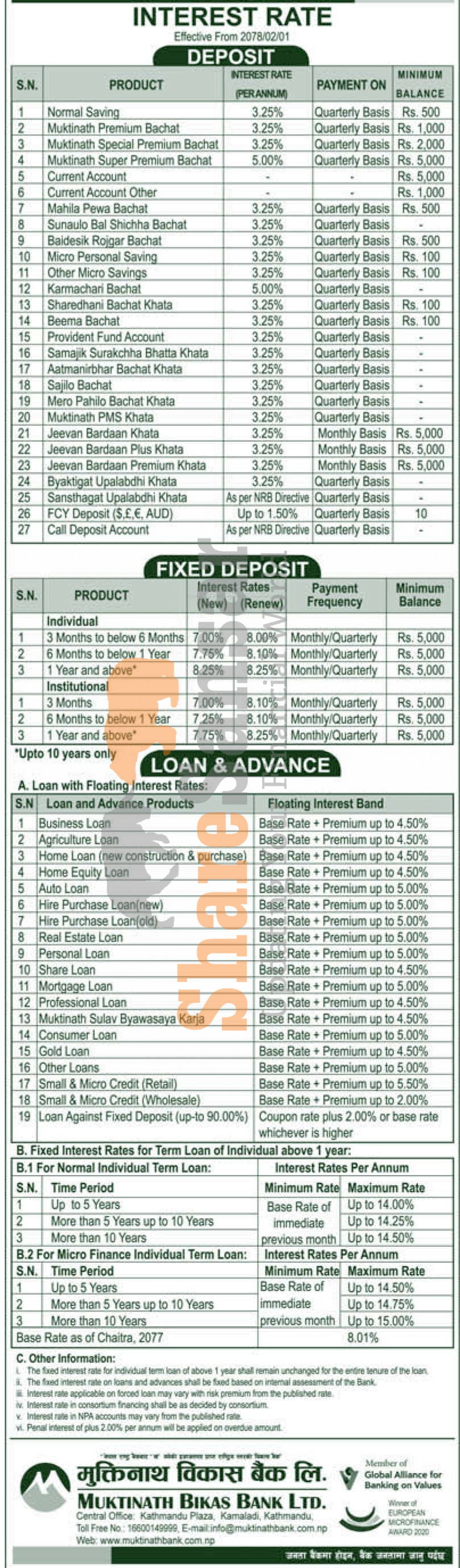 Muktinath Bikas Bank Limited has published a notice regarding the new interest rate for deposit and loan products and it's effective from 1st Jestha, 2078.