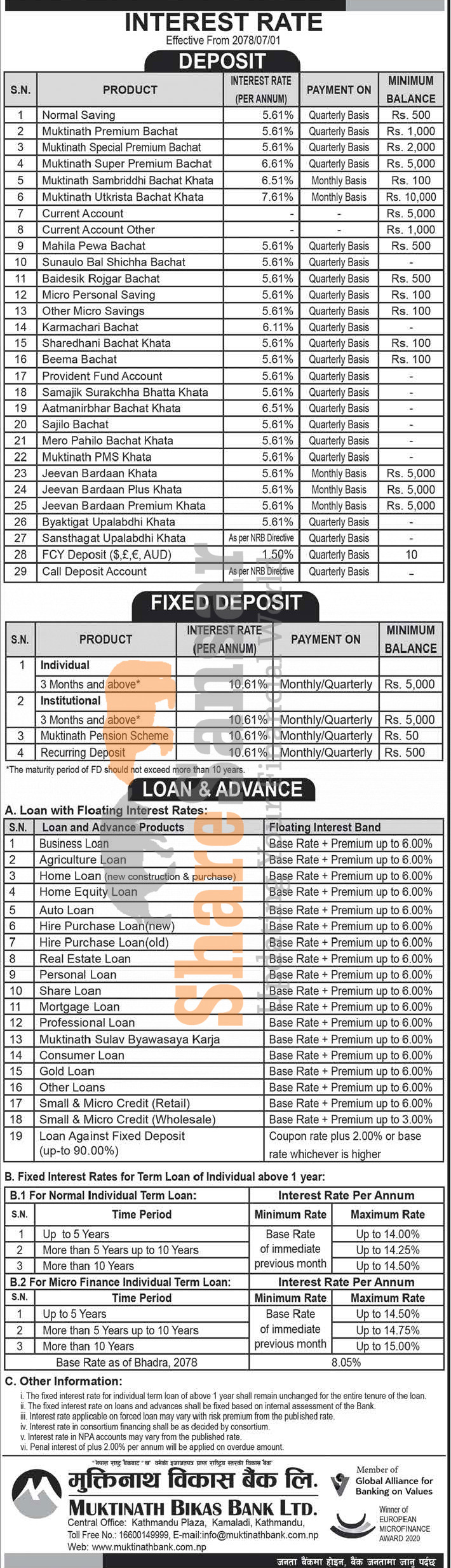 Muktinath Bikas Bank Limited has published a notice regarding the new interest rate for deposit and loan products and it's effective from 1st Kartik, 2078.