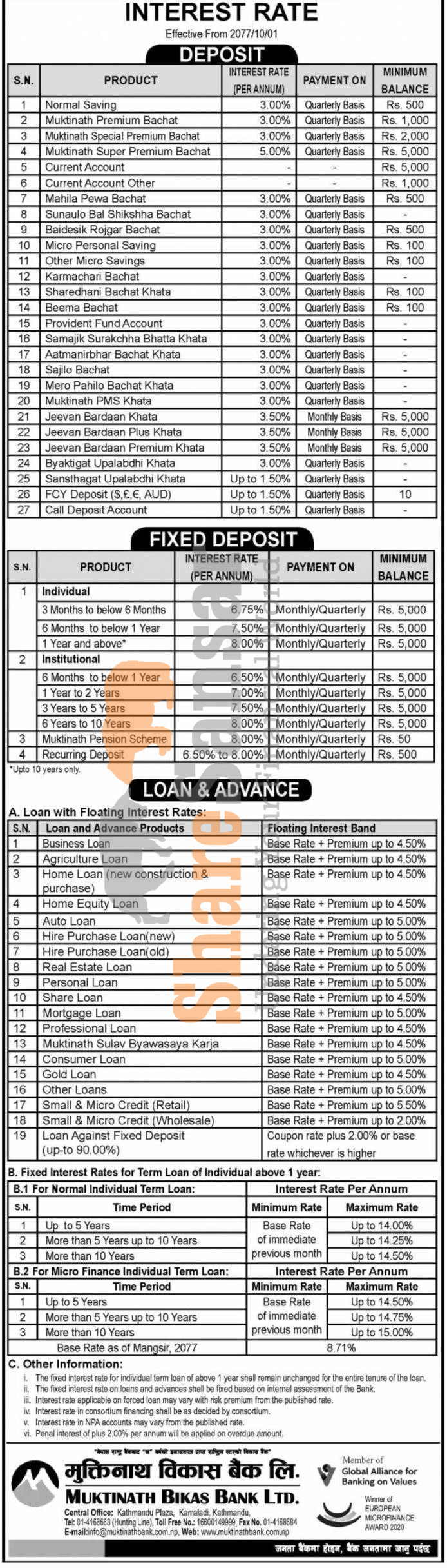 Muktinath Bikas Bank Limited has published a notice regarding the new interest rate for deposit and loan products and it's effective from 1st Magh, 2077.