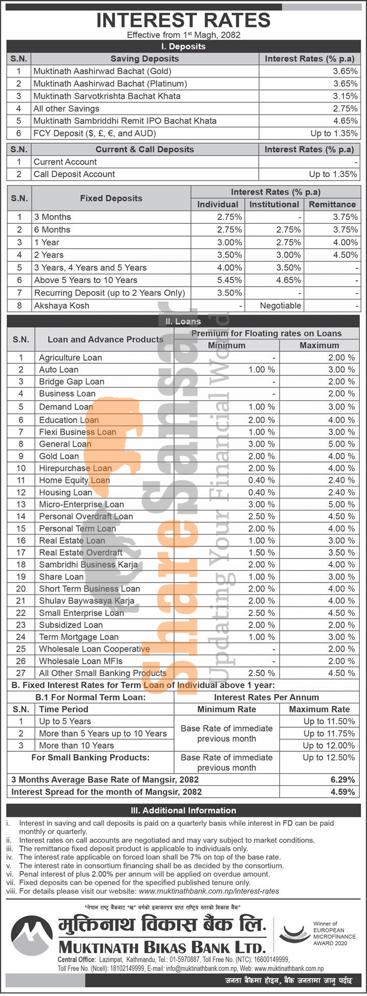 Muktinath Bikas Bank Limited has published a notice regarding the new interest rate for deposit and loan products and it's effective from 1st Magh, 2082.