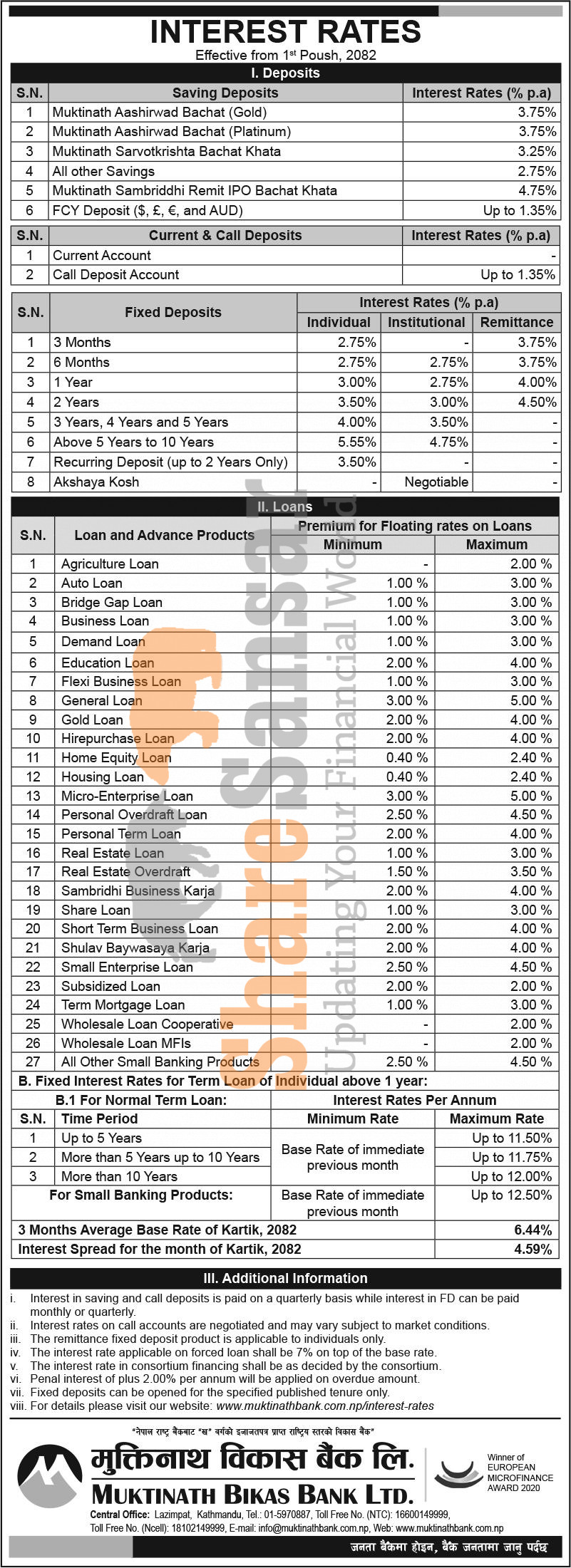 Muktinath Bikas Bank Limited has published a notice regarding the new interest rate for deposit and loan products and it's effective from 1st Poush, 2082.