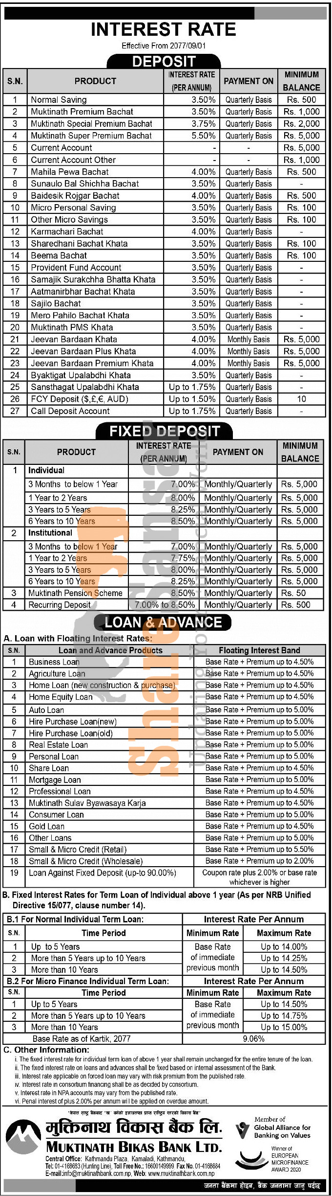 Muktinath Bikas Bank Limited has published a notice regarding the new interest rate for its deposit and loan products and it's effective from 1st Poush, 2077.