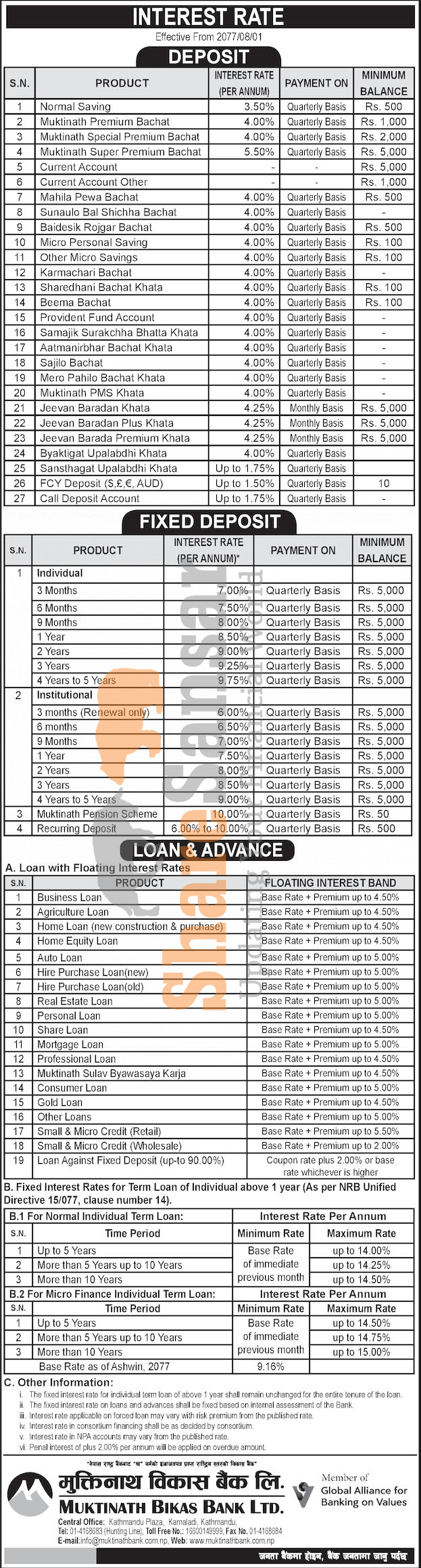 Muktinath Bikas Bank Limited has published a notice regarding the new interest rate for its deposit products and it's effective from 1st Mangsir, 2077.