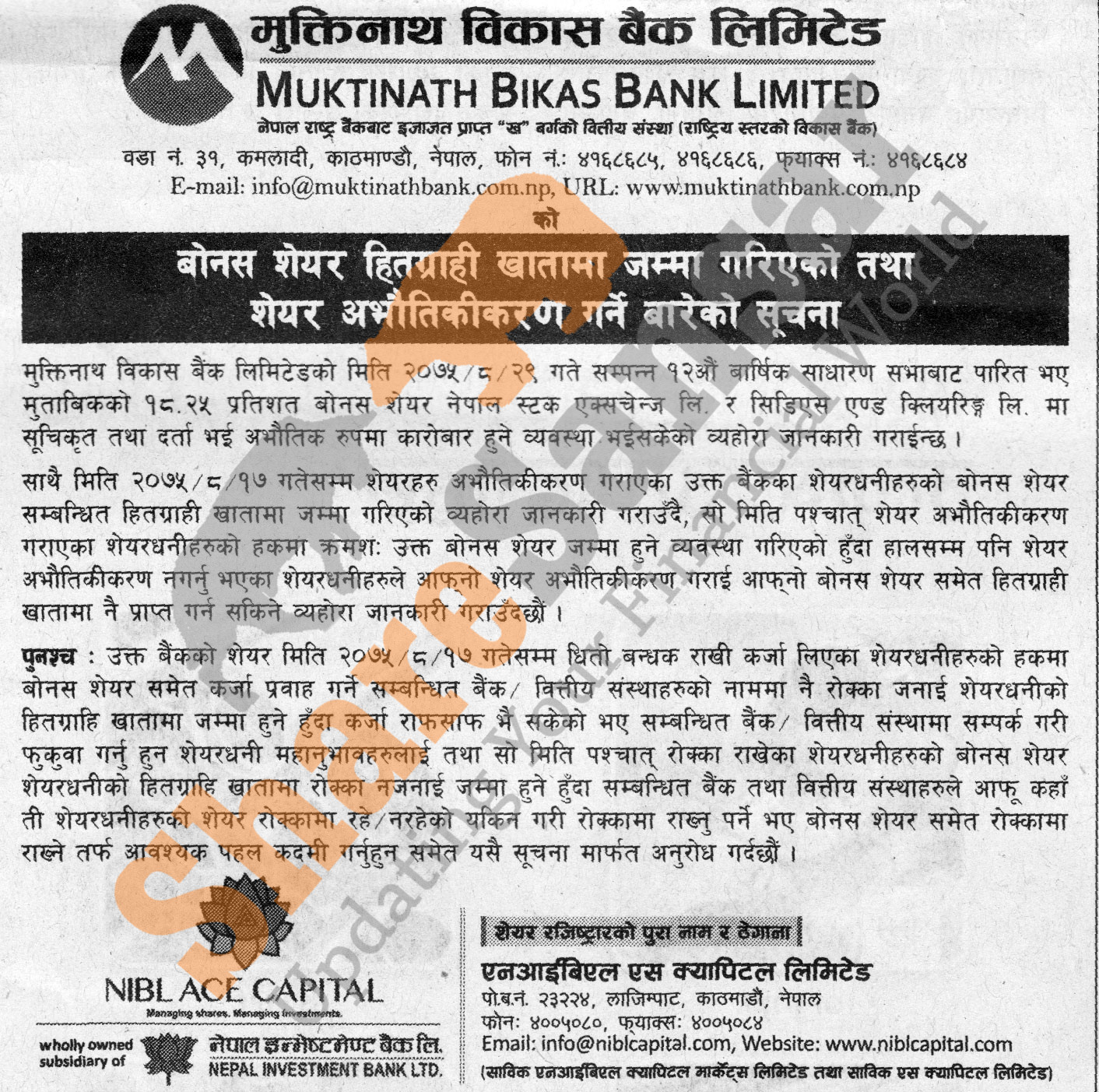 Muktinath Bikas Bank Limited is distributing 18.25% bonus share directly to DEMAT accounts and urged its shareholders to dematerialize their shares.