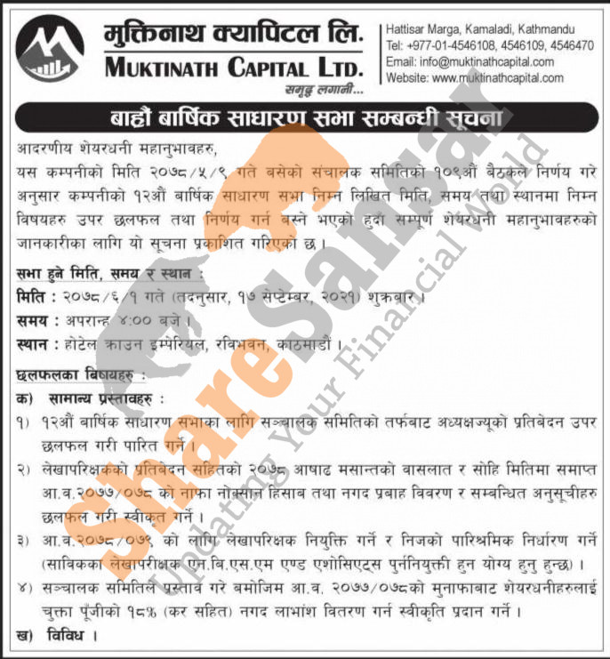 Muktinath Capital Limited has announced its 12th AGM going to be held on 1st Ashwin, 2078.
