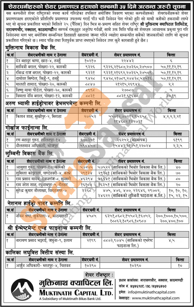 Muktinath Capital Limited has published a notice regarding a claim for lost share certificates.