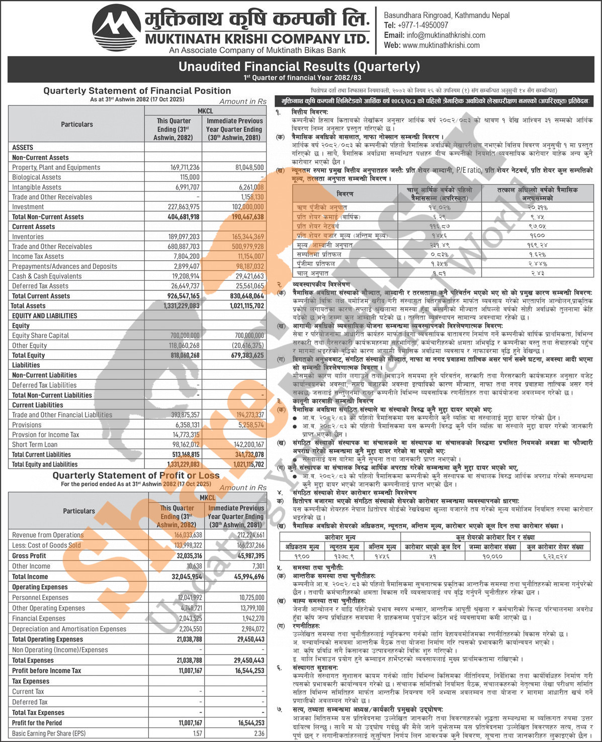 Muktinath Krishi Company Limited has posted a net profit of Rs 11 million and published its 1st quarter company analysis of the fiscal year 2082/83.