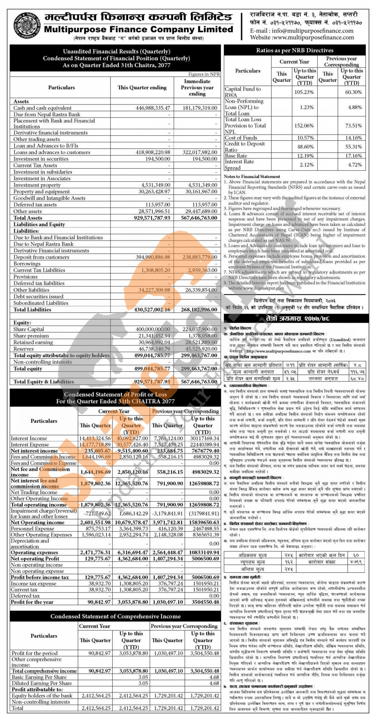 Multipurpose Finance Company Limited has posted a net profit of Rs 3.05 million and published its 3rd quarter company analysis of the fiscal year 2077/78.