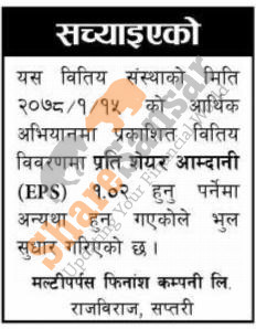 Multipurpose Finance Company Limited has published a notice regarding amendment of EPS in its 3rd quarterly report of fiscal year 2077/78.