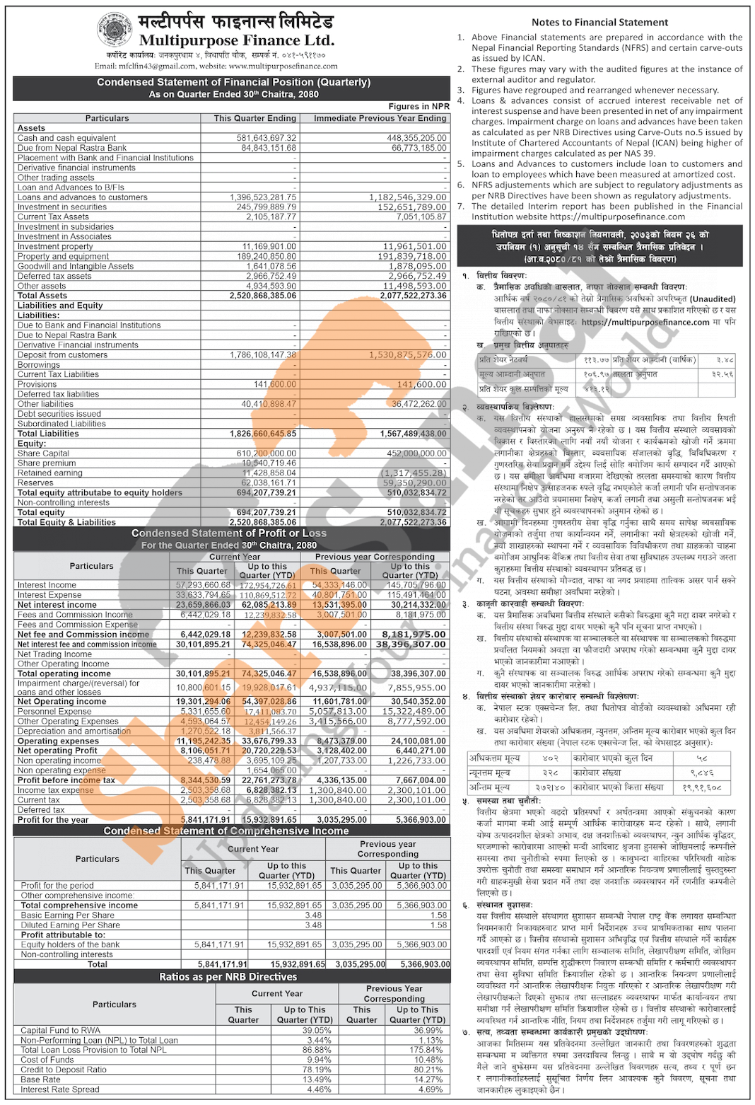 Multipurpose Finance Limited has posted a net profit of Rs 15.93 million and published its 3rd quarter company analysis of the fiscal year 2080/81.