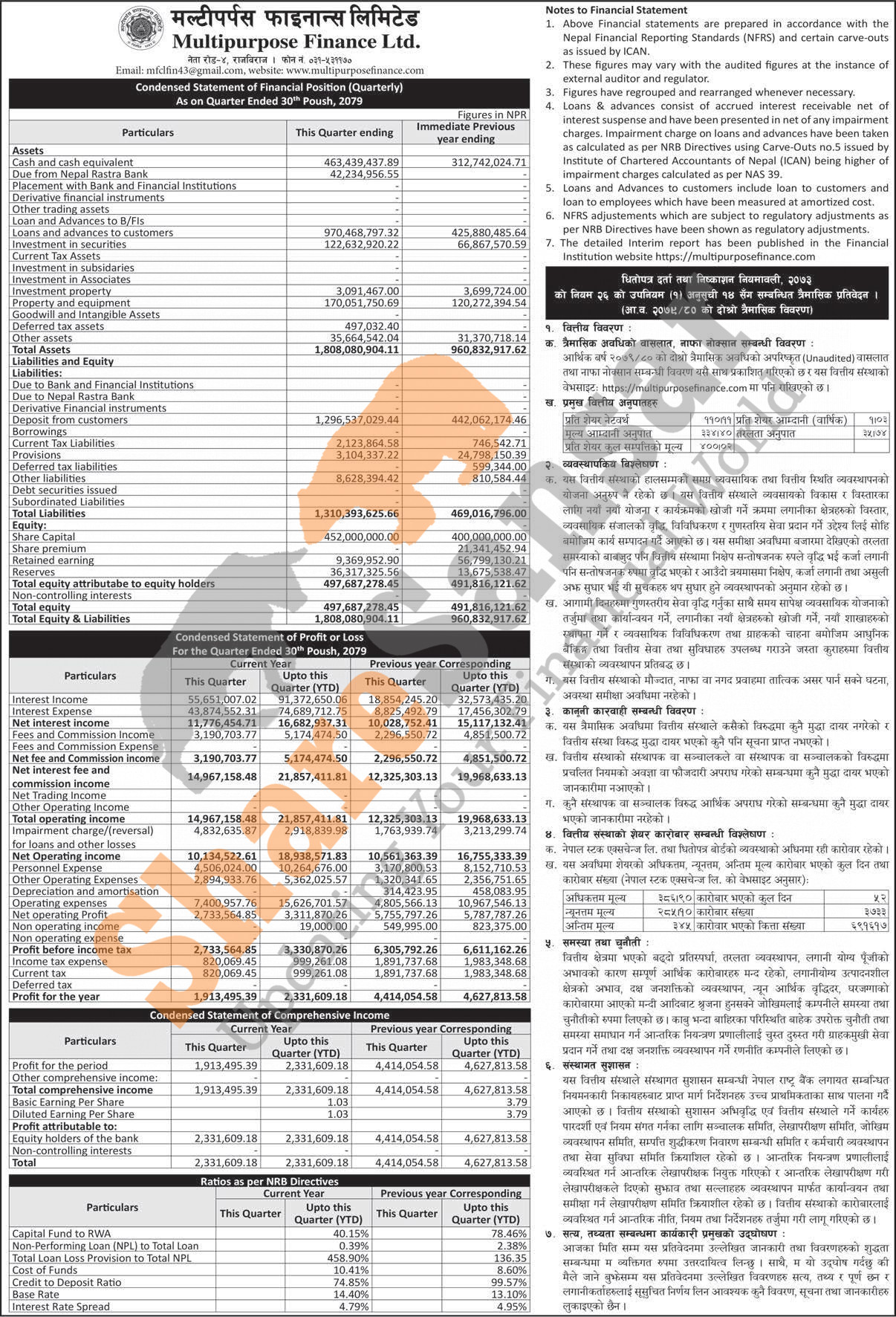 Multipurpose Finance Limited has posted a net profit of Rs 2.33 million and published its 2nd quarter company analysis of the fiscal year 2079/80.