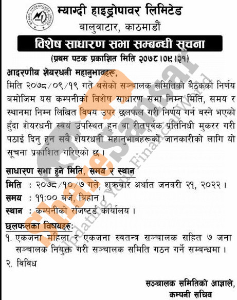 Myagdi Hydropower Limited has announced its SGM going to be held on 7th Magh, 2078.