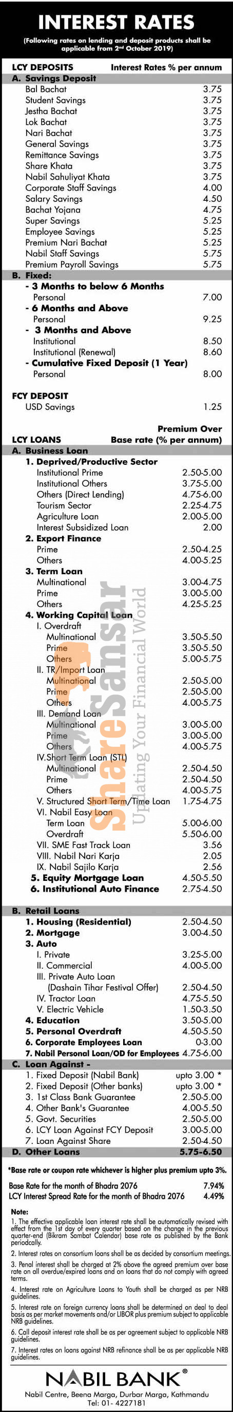 Nabil Bank Limited has published a notice regarding new interest rate and its effective from 15th Ashwin, 2076.