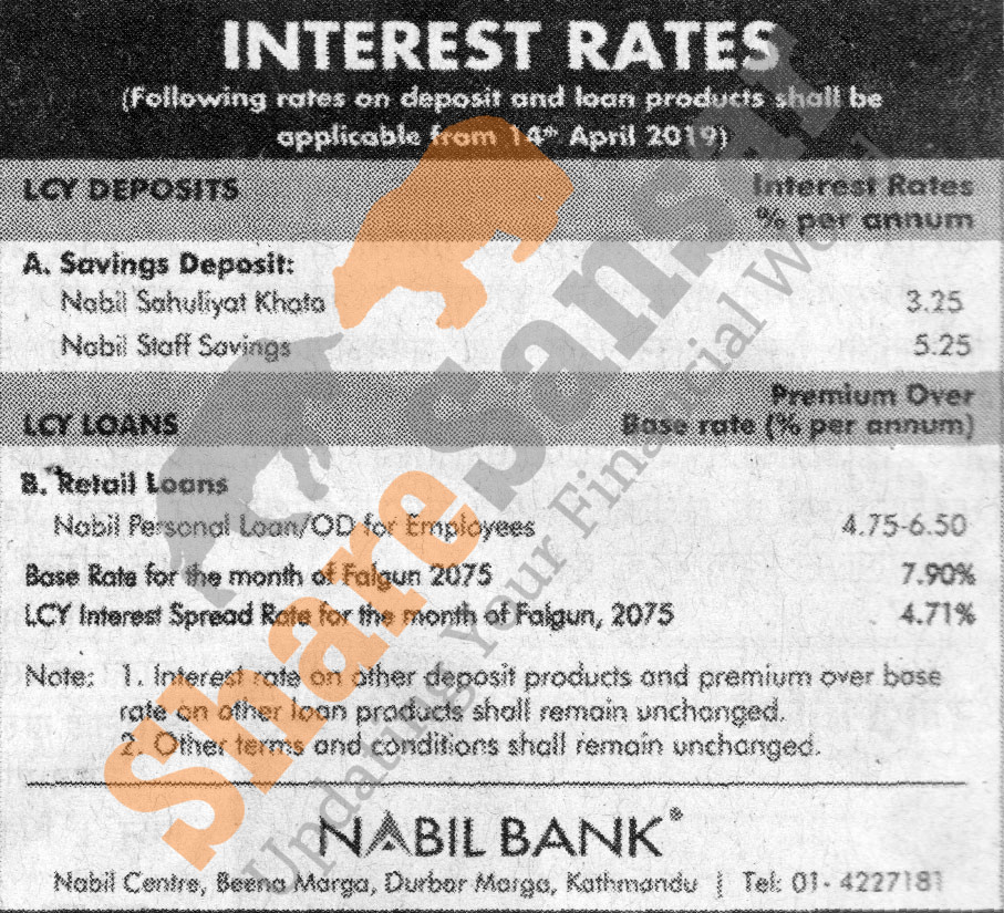 Nabil Bank Limited has published a notice regarding new interest rate and its effective from 1st Baishakh, 2076.
