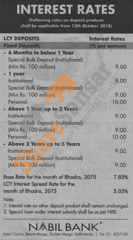 Nabil Bank Limited has published a notice regarding new interest rate and its effective from 26th Ashwin, 2075.