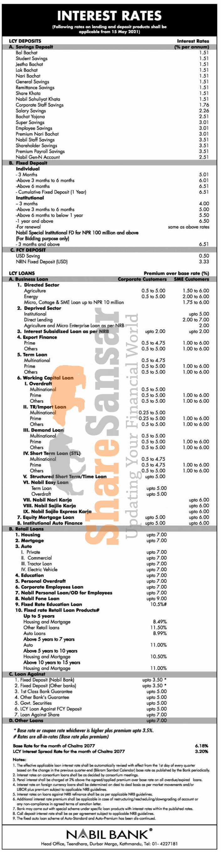 Nabil Bank Limited has published a notice regarding the new interest rate for deposit and loan products and it's effective from 1st Jestha, 2078.