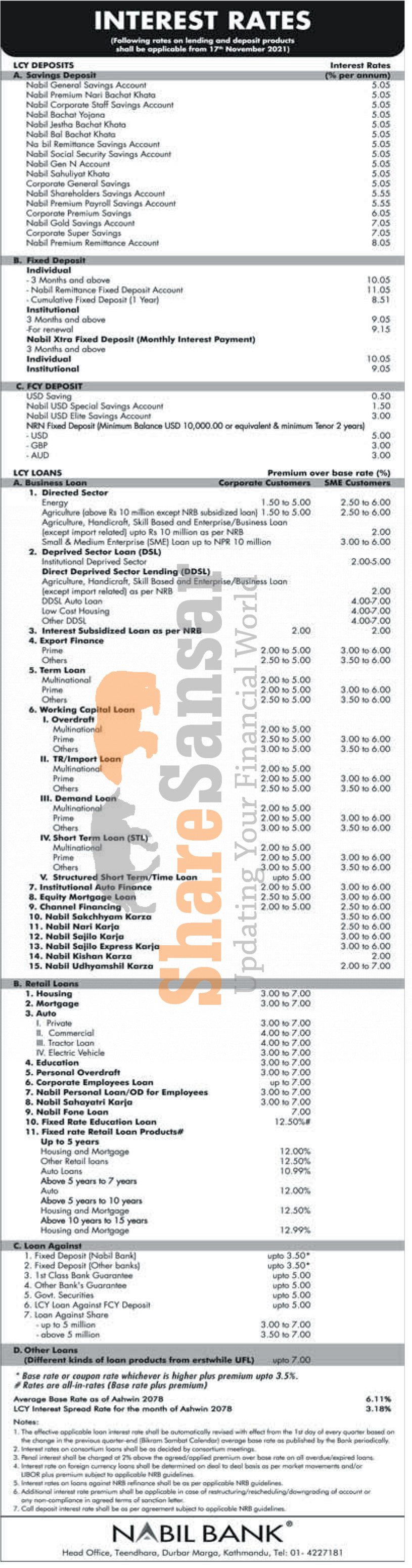 Nabil Bank Limited has published a notice regarding the new interest rate for deposit and loan products and it's effective from 1st Mangsir, 2078.
