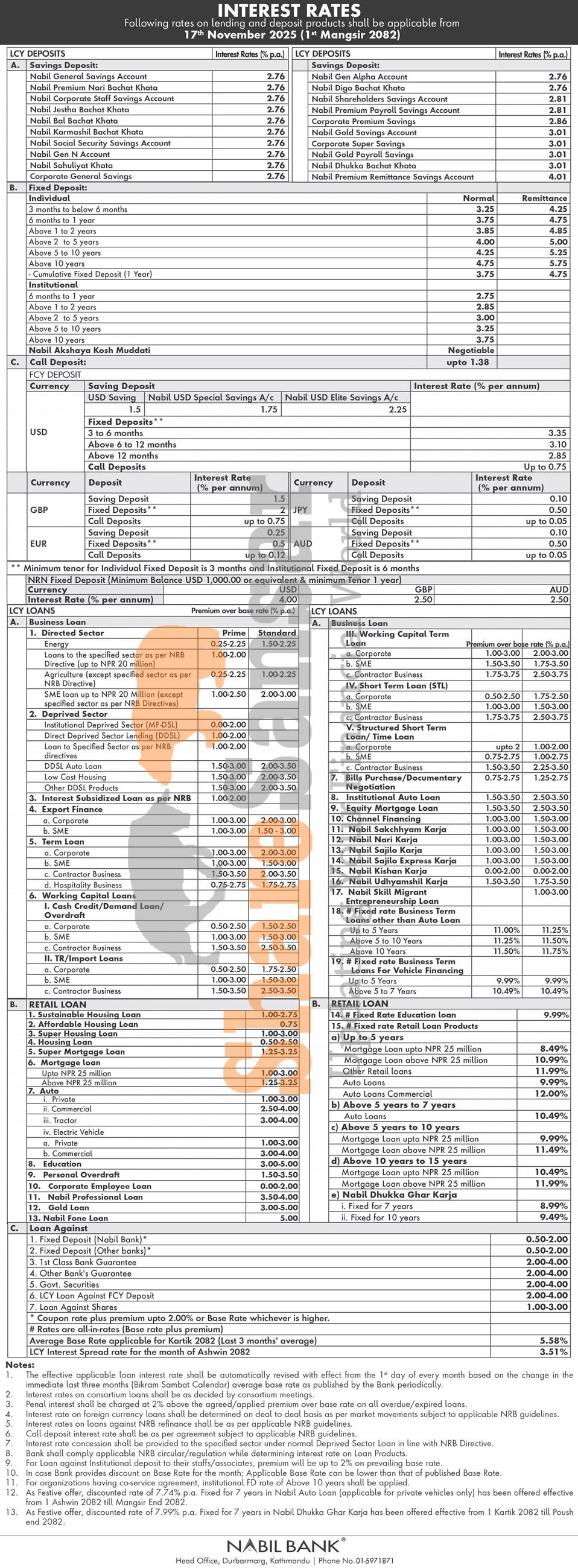 Nabil Bank Limited has published a notice regarding the new interest rate for deposit and loan products and it's effective from 1st Mangsir, 2082.