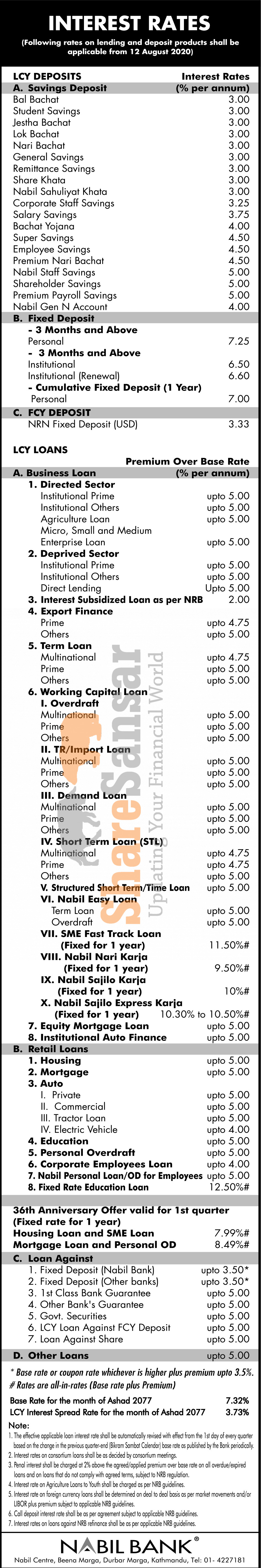 Nabil Bank Limited has published a notice regarding the new interest rate for its deposit and loan products and its effective from 28th Shrawan, 2077.