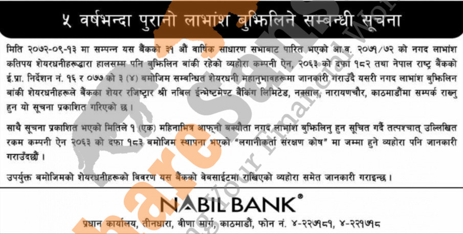 Nabil Bank Limited has published a notice to collect uncollected due dividend to its shareholders.