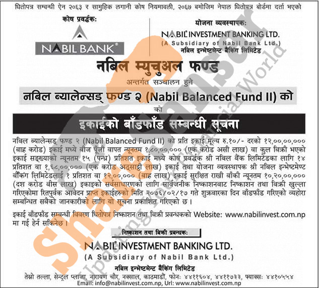 Nabil Investment Banking Limited has allotted its 120 million units of Rs 10 face value each mutual fund scheme worth Rs 1.2 billion (Nabil Balance Fund- 2) to the general public on 17th Jestha, 2076.