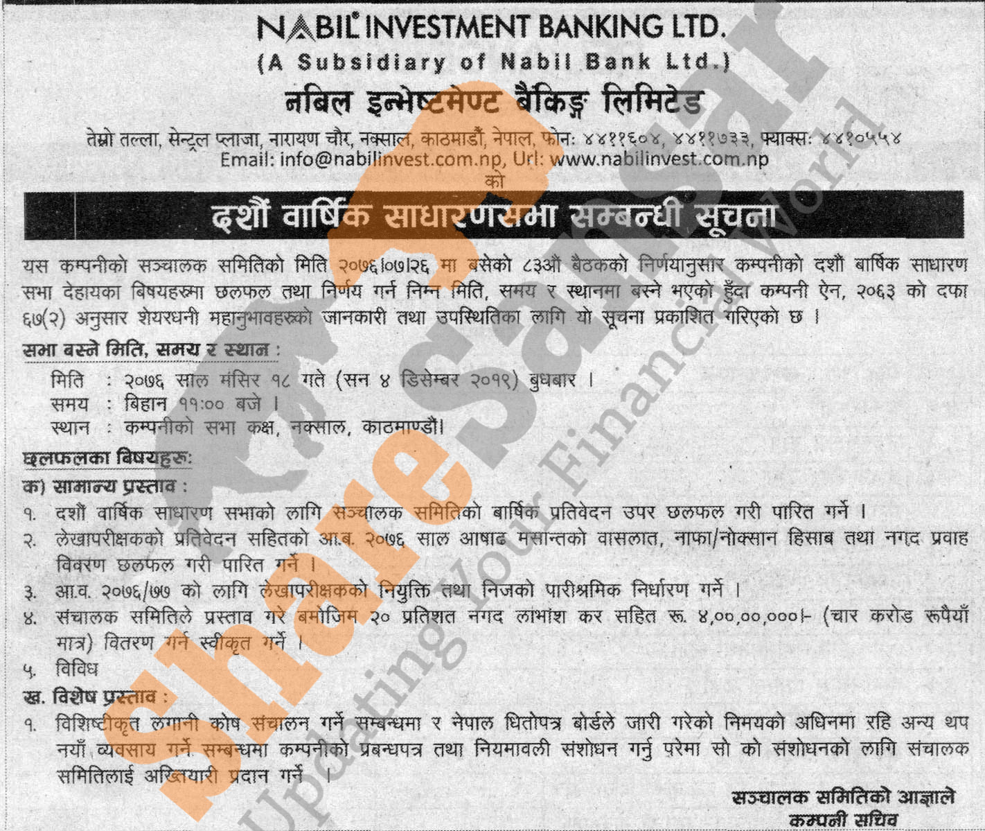 Nabil Investment Banking Limited has announced its 10th AGM going to be held on 18th Mangsir, 2076.