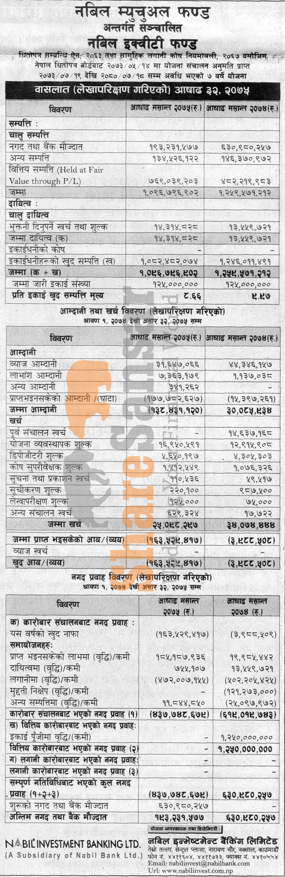 Nabil Investment Banking Limited has published its financial highlight of “Nabil Equity Fund” of a fiscal year 2074/75.