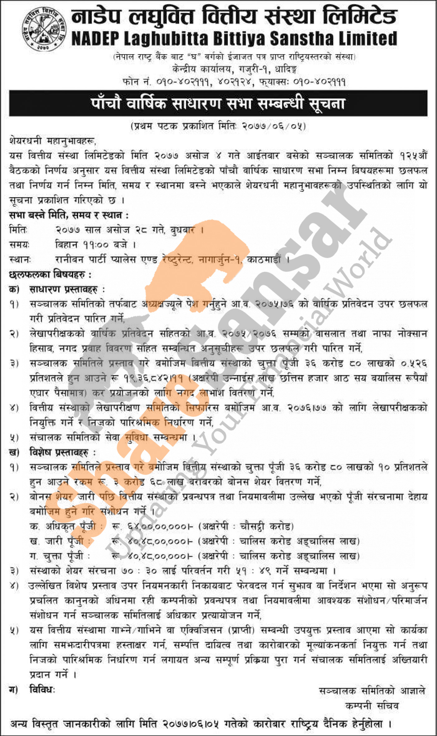 Nadep Laghubitta Bittiya Sanstha Limited has announced its 5th AGM going to be held on 28th Ashwin, 2077.