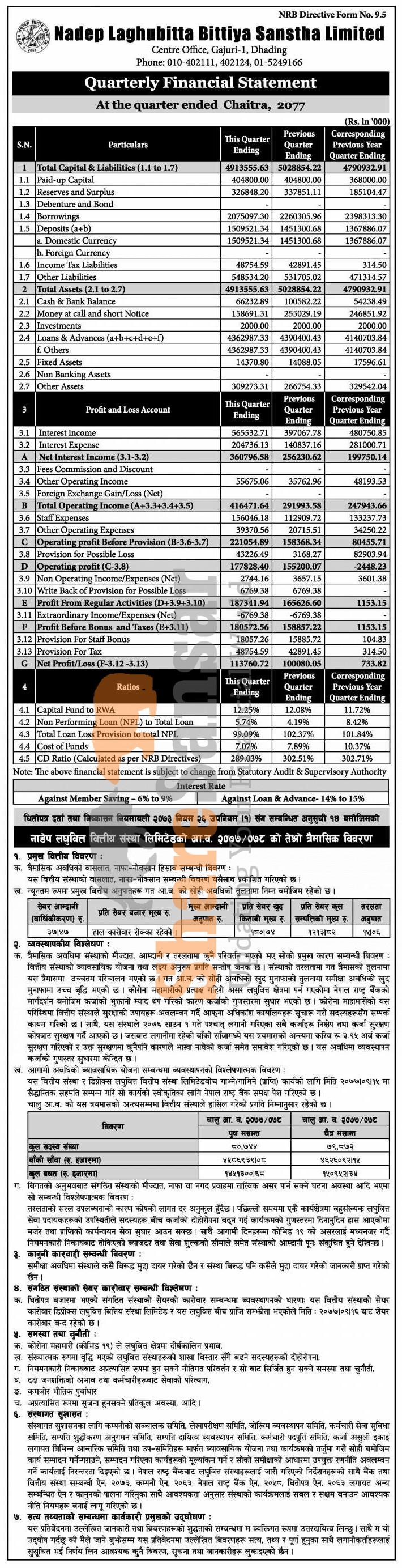 Nadep Laghubitta Bittiya Sanstha Limited has posted a net profit of Rs 113.76 million and published its 3rd quarter company analysis of the fiscal year 2077/78.