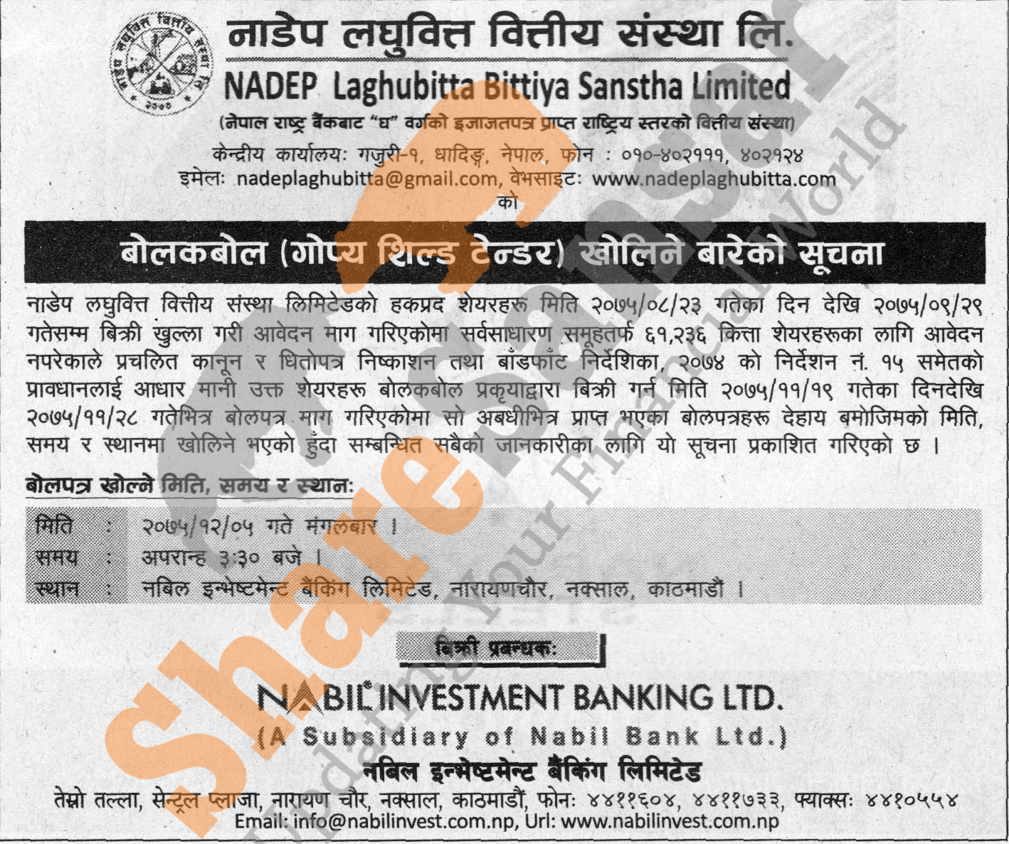 Nadep Laghubitta Bittiya Sanstha Limited has published a notice regarding bid opening date of 61,236 units ordinary share in auction to the general public today (5th Chaitra, 2075).