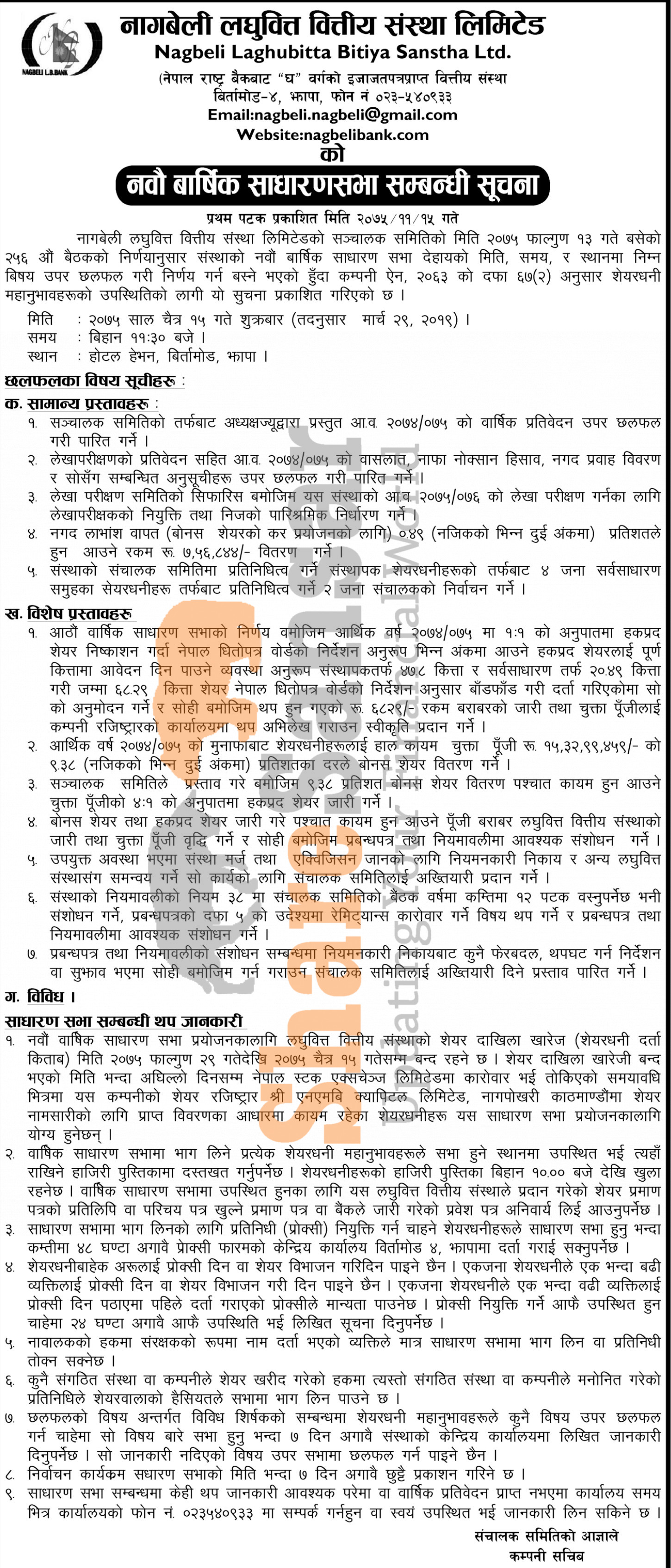 Nagbeli Laghubitta Bittiya Sanstha Limited has announced its 9th AGM going to be held on 15th Chaitra, 2075.