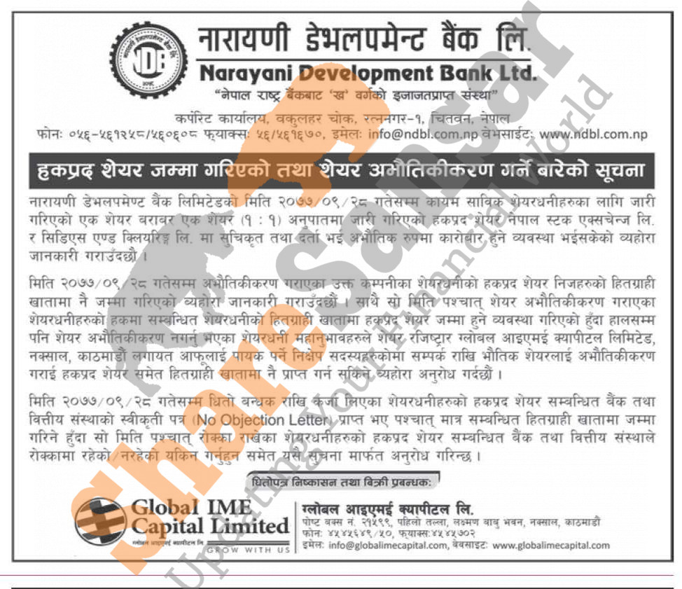 Narayani Development Bank Limited has distributed its 1:1 ratio right share to its shareholders and has urged its shareholders to dematerialize their shares.