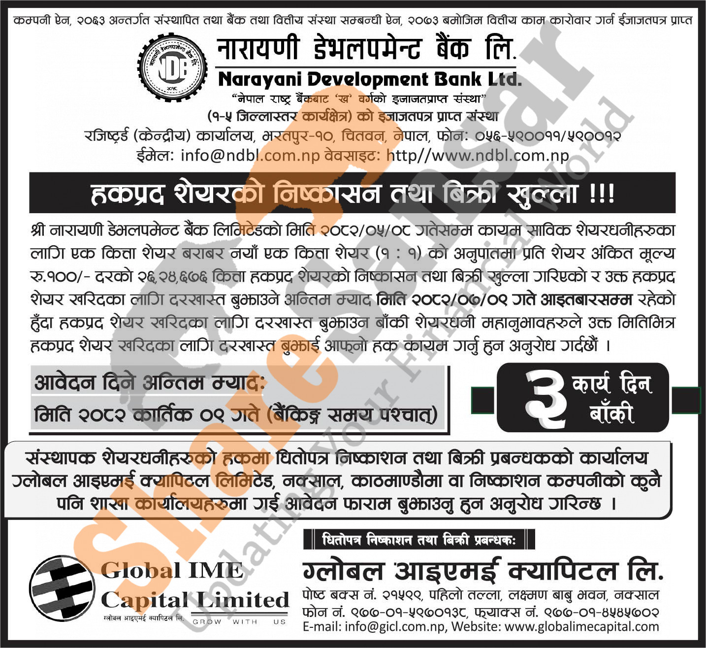 Narayani Development Bank Limited has published a notice regarding 3 days remaining for its ongoing 1:1 ratio right share.