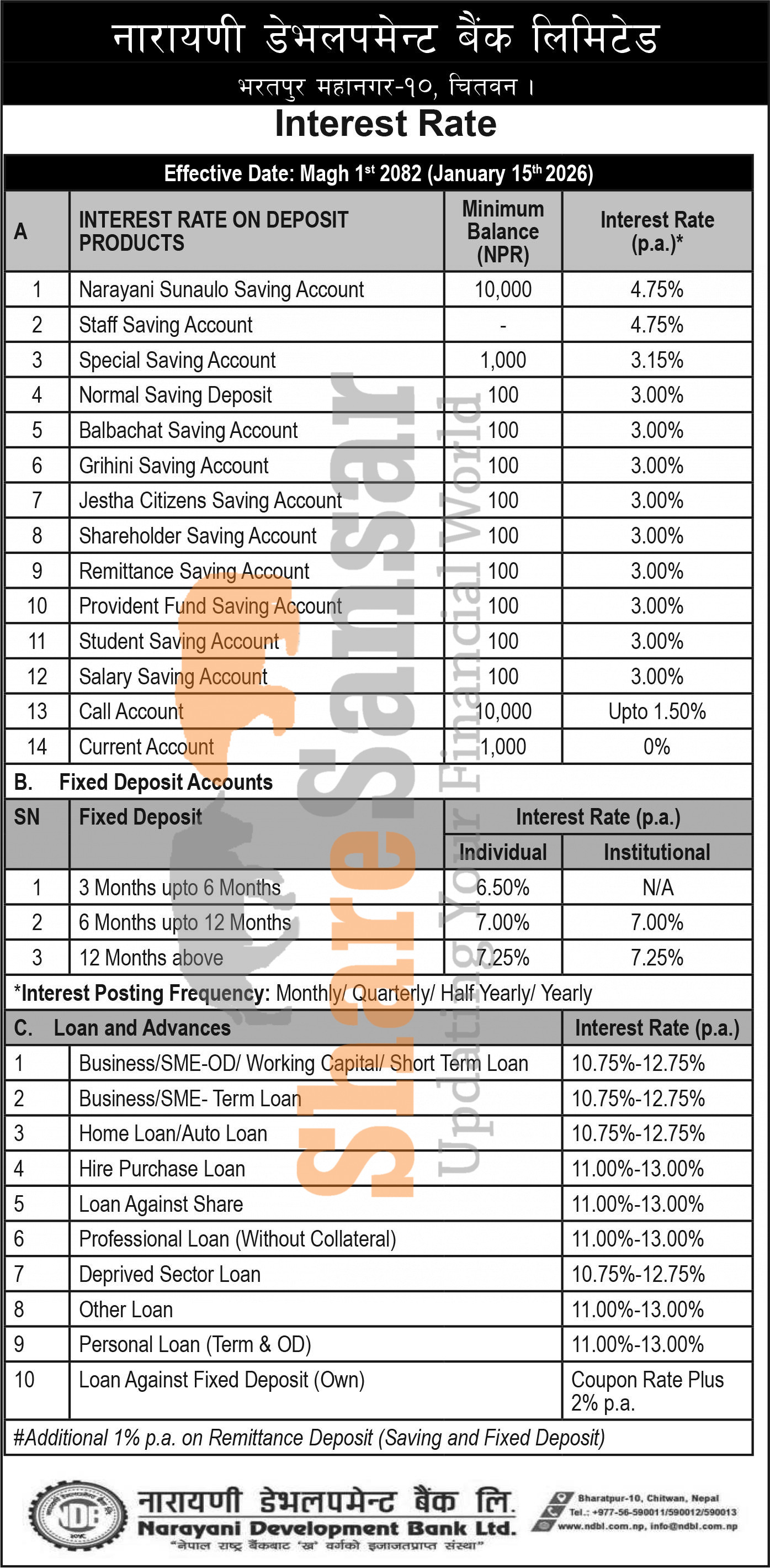 Narayani Development Bank Limited has published a notice regarding the new interest rate for deposit and loan products and it's effective from 1st Magh, 2082.
