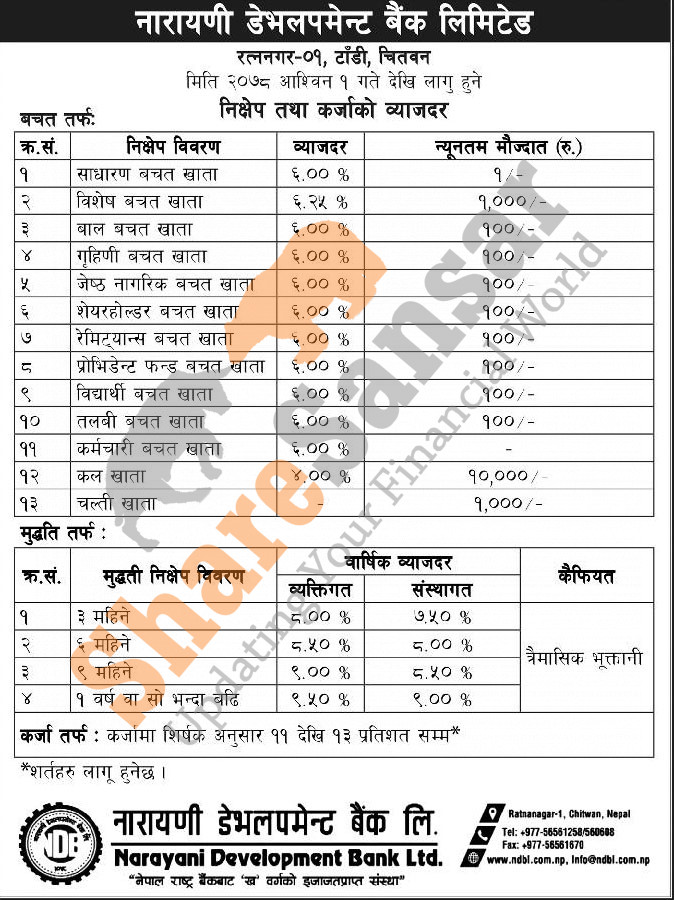 Narayani Development Bank Limited has published a notice regarding the new interest rate on deposit and loan products and it's effective from 1st Ashwin, 2078.