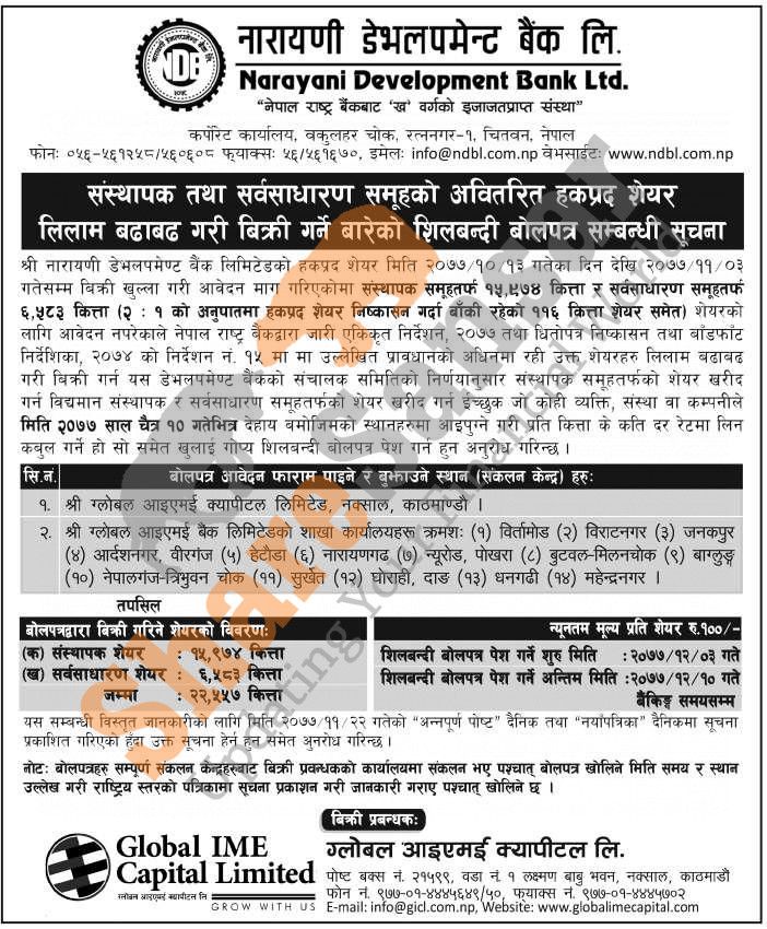 Narayani Development Bank Limited is selling its 15,974 units promoter right share and its 2:1 ratio 6,583 units ordinary right share in an auction to the general public from today (3rd Chaitra, 2077).