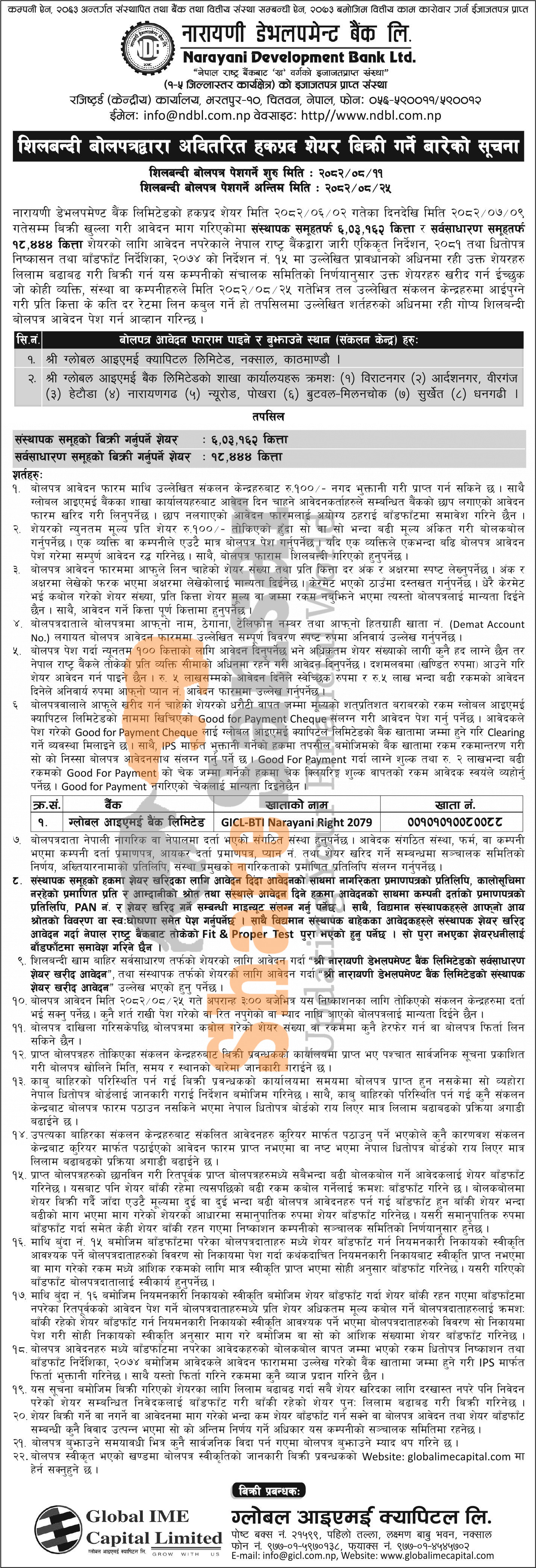 Narayani Development Bank Limited is selling its 6,03,162 units promoter right shares and 18,444 units ordinary right shares in an auction to the interested person/company/institutions from 11th Mangsir to 25th Mangsir, 2082.