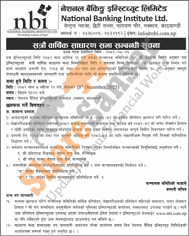 National Banking Institute Limited has announced its 17th AGM going to be held on 22nd Mangsir, 2082.