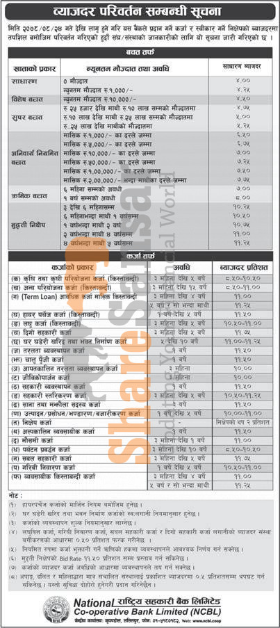National Co-operative Bank Limited has published a notice regarding new revised interest rate for deposit and loan products and it's effective from 24th Mangsir, 2078.