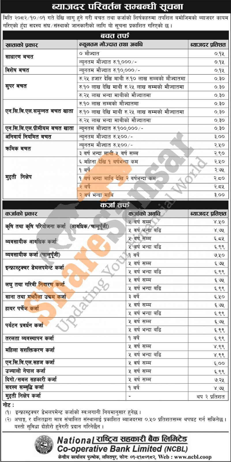 National Co-operative Bank Limited has published a notice regarding the change of interest rate on deposit and loan and it's effective from 17th Magh, 2082.