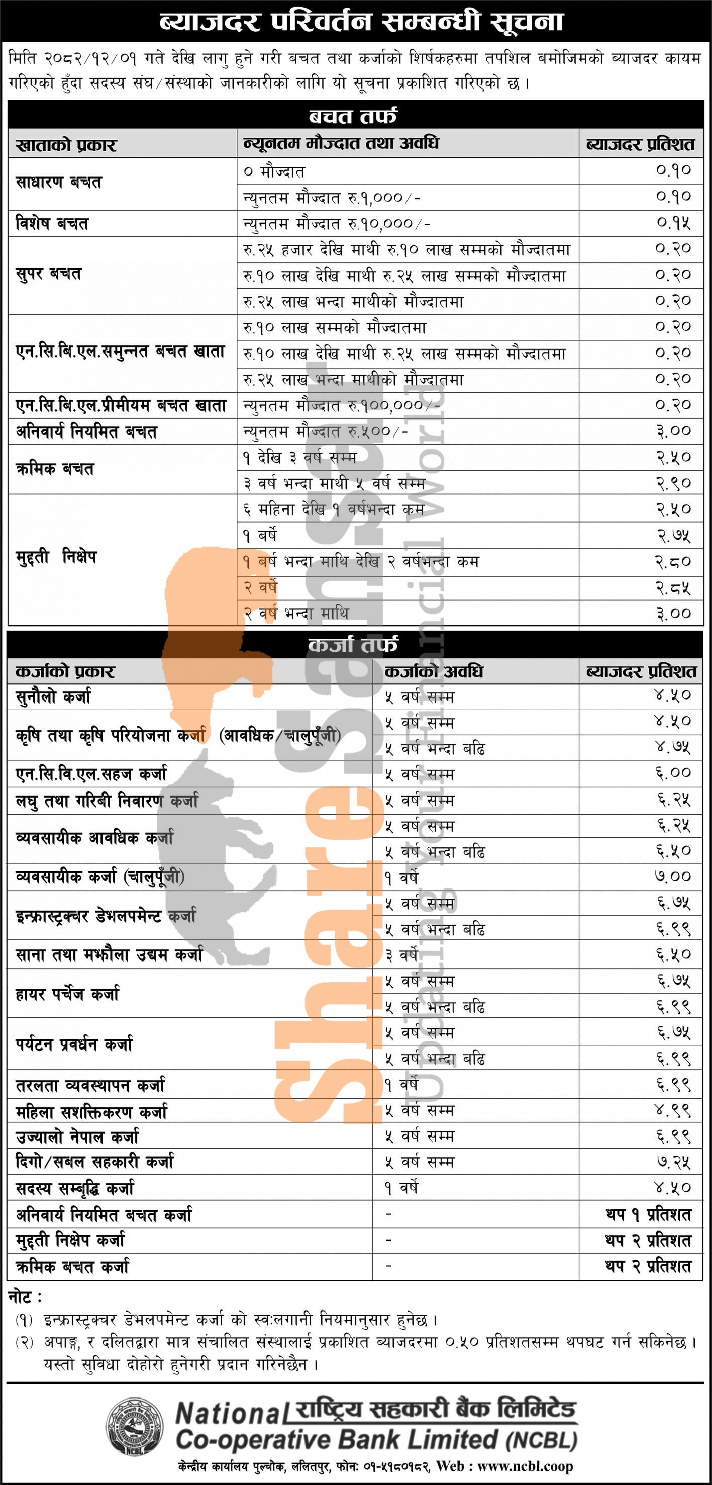 National Co-operative Bank Limited has published a notice regarding the change of interest rate on deposit and loan and it's effective from 1st Chaitra, 2082.