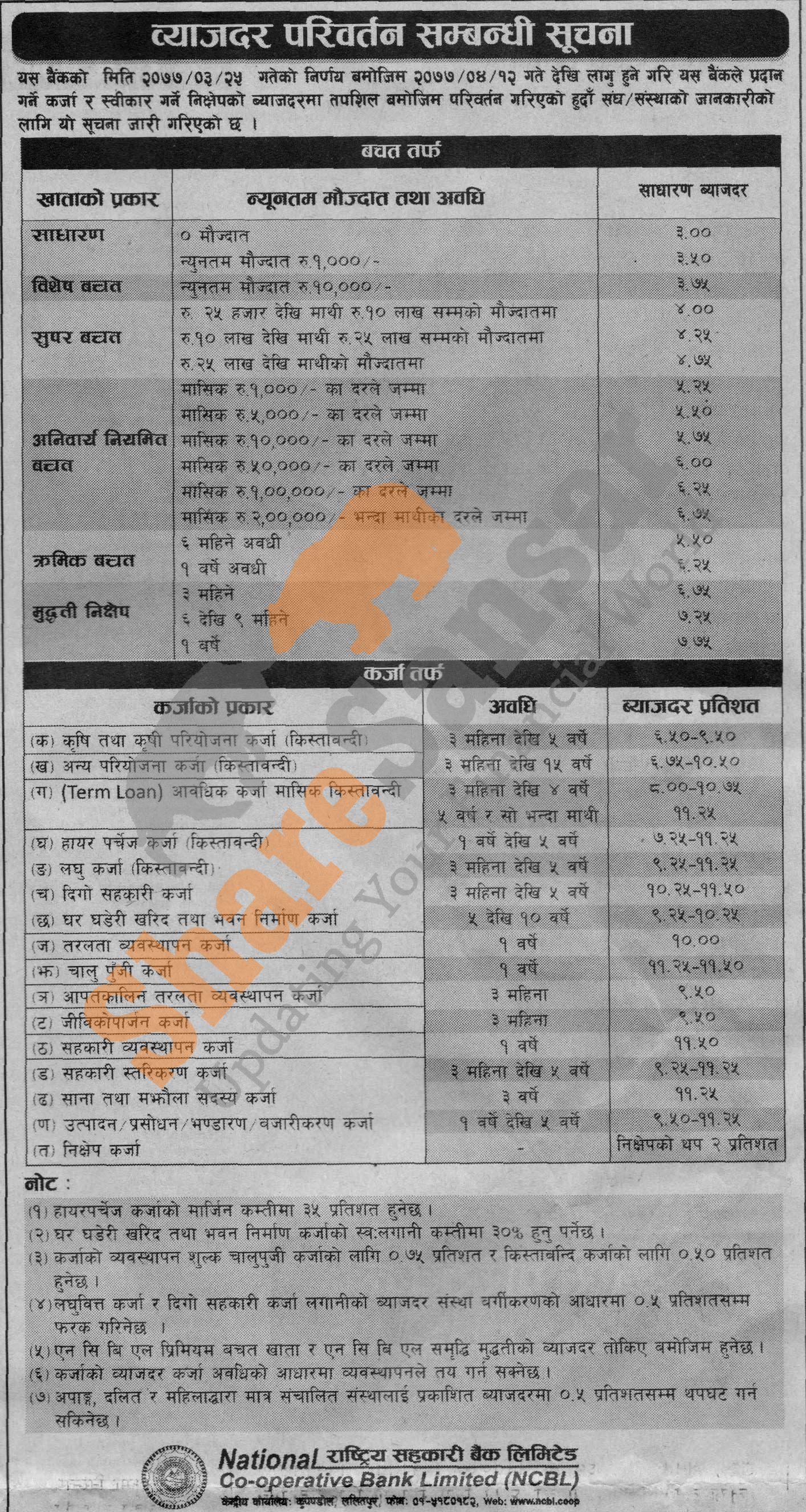 National Co-operative Bank Limited has published a notice regarding the interest rate on the various deposit and loan products and its effective from 12th Shrawan, 2077.