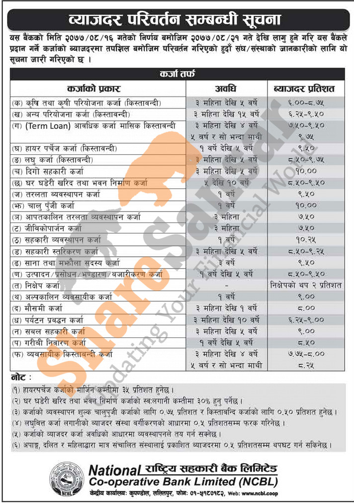 National Co-operative Bank Limited has published a notice regarding the new interest rate for its loan products and it's effective from 21st Mangsir, 2077.