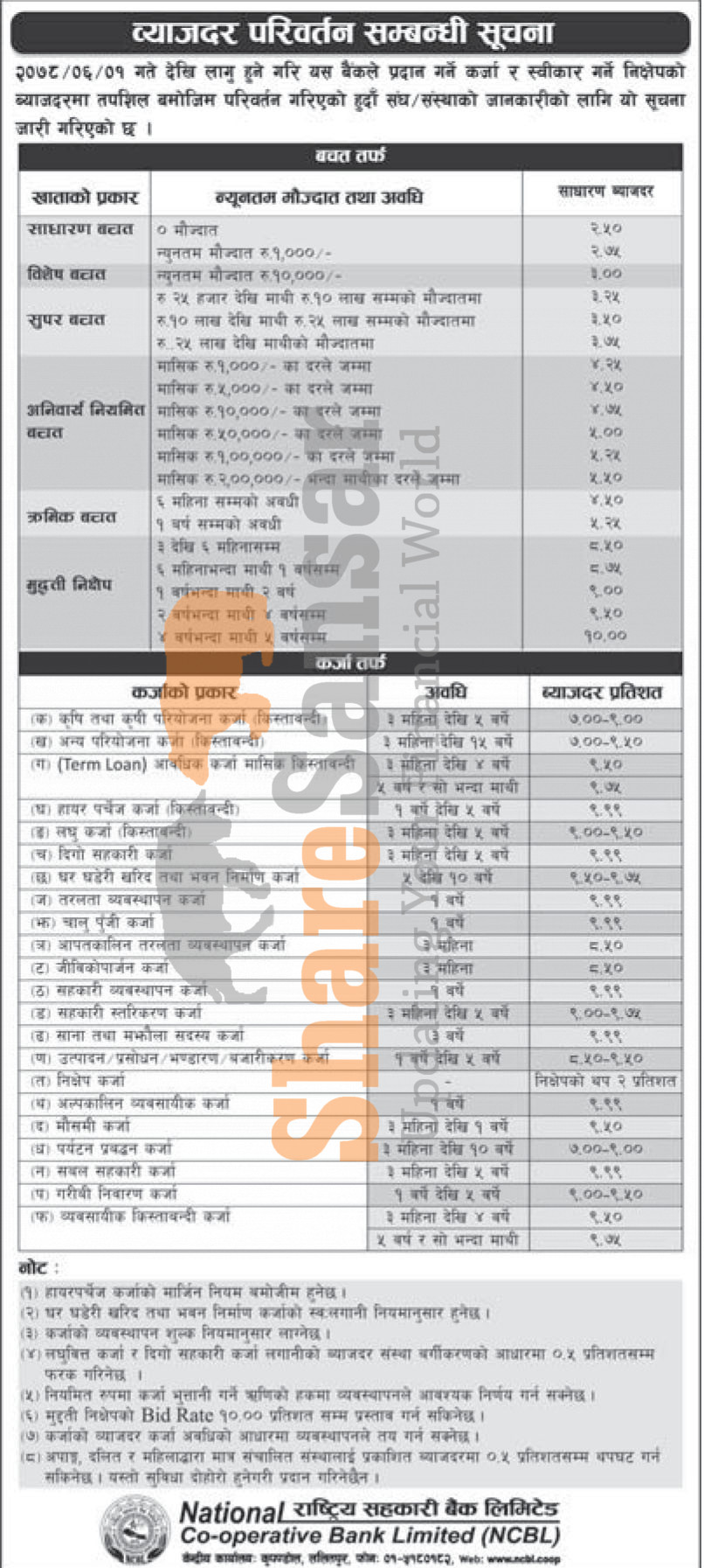National Co-operative Bank Limited has published a notice regarding the new interest rate on deposit and loan products and it's effective from 1st Ashwin, 2078.