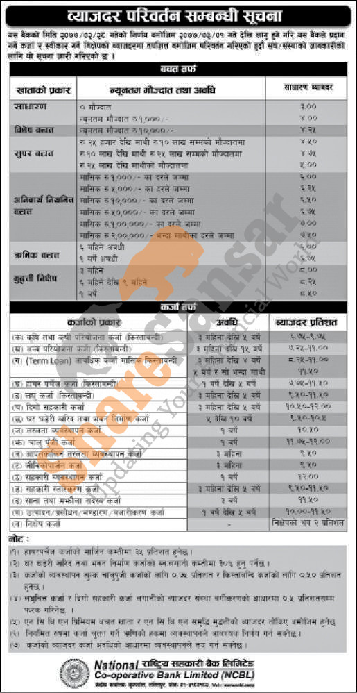 National Cooperative Bank Limited has published a notice regarding new interest rate and its effective from 1st Ashad, 2077.