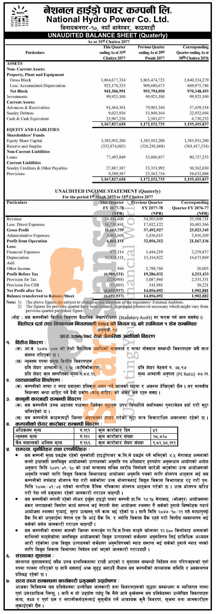 National Hydro Power Company Limited has posted a net loss of Rs 6.69 million and published its 3rd quarter company analysis of the fiscal year 2077/78.